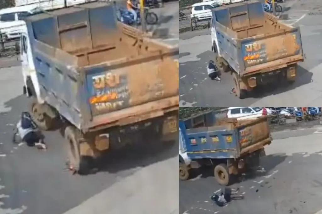 सोशल मीडिया प्लेटफॉर्म एक्स पर ‘घर के कलेश’ नामक यूजर हैंडल से एक वीडियो पोस्ट किया गया है। इस वीडियो में डंपर चालक अपने वाहन को मोड़ते वक्त एक बाइक सवार को बीच सड़क पर ही रौंदता नजर आ रहा है। बीच सड़क हुए इस हादसे में बाइक बुरी तरह से क्षतिग्रस्त होती देखी जा सकती है। राहत की बात ये है कि इस भीषण मार्ग दुर्घटना की चपेट में आने के बावजूद बाइक सवार की जान बचती नजर आ रही है। बता दें कि ये वायरल वीडियो महाराष्ट्र के ठाणे जिले में स्थित अंबरनाथ शहर का है जिसमें डंपर चालक द्वारा बाइक सवार को रौंदते देखा जा सकता है।