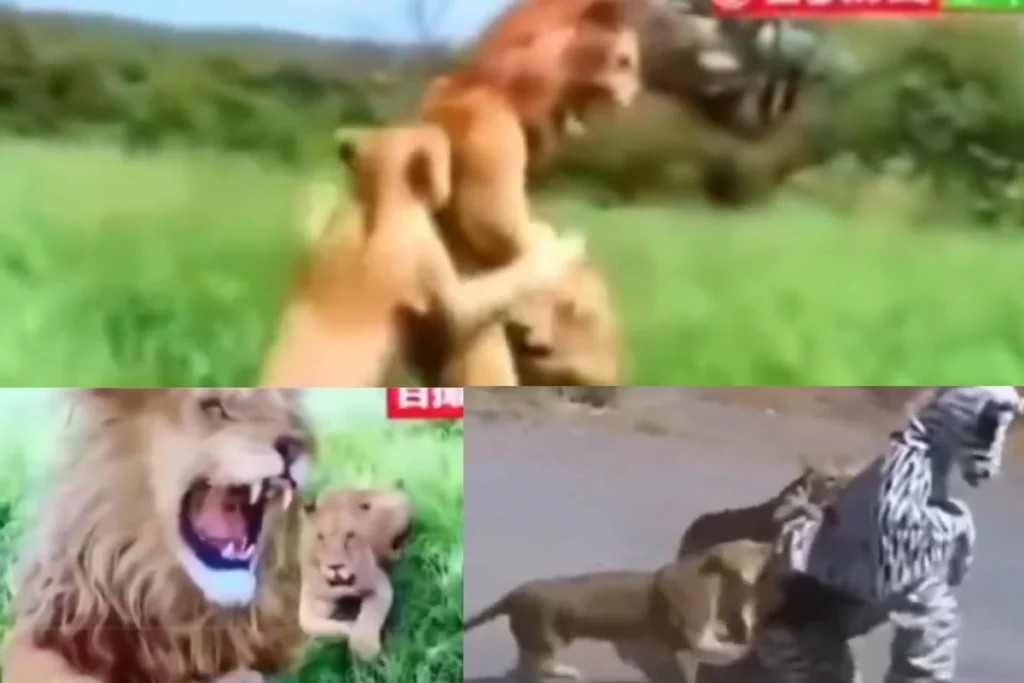 वीडियो में दो अलग-अलग क्लिप को जोड़ा गया है। पहली में एक आदमी नकली शेर बनकर असली शेरों के साथ सेल्फी लेने पहुंच जाता है। वह उनके साथ मस्ती कर ही रहा होता है। तभी वह शेर समझ जाते हैं और आदमी को दौड़ा देते हैं। इसके बाद आदमी जान बचाने के लिए पेड़ पर चढ़ जाता है। इस वीडियो के दूसरे क्लिप में देखा जा सकता है कि, दो आदमी जेब्रा की ड्रेस पहनकर शेरों के बीच पहुंचते हैं और जमकर मस्ती कर रहे होते हैं। लेकिन तभी उन पर जंगल का राजा हमला कर देते हैं और दोनों को भागकर अपनी जान बचानी पड़ती है।