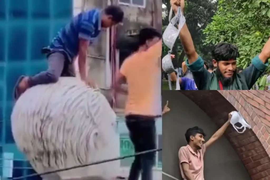 बंग्लादेश के विभिन्न हिस्सों में जारी विरोध के बीच ही सोशल मीडिया पर प्रदर्शन से जुड़ा एक घिनौना रूप सामने आया है जिसमें एक उपद्रवी को शेख मुजीबुर्रहमान की प्रतिमा पर पेशाब करते देखा जा सकता है। वहीं कई ऐसे प्रदर्शनकारी हैं जो प्रधानमंत्री आवास से महिलाओं के अंडरगारमेंट्स लेकर भागते देखे जा रहे हैं। इस पूरे प्रकरण का वीडियो अब सोशल मीडिया पर तेजी से वायरल (Viral Video) हो रहा है जिसको लेकर खूब सुर्खियां बन रही हैं।