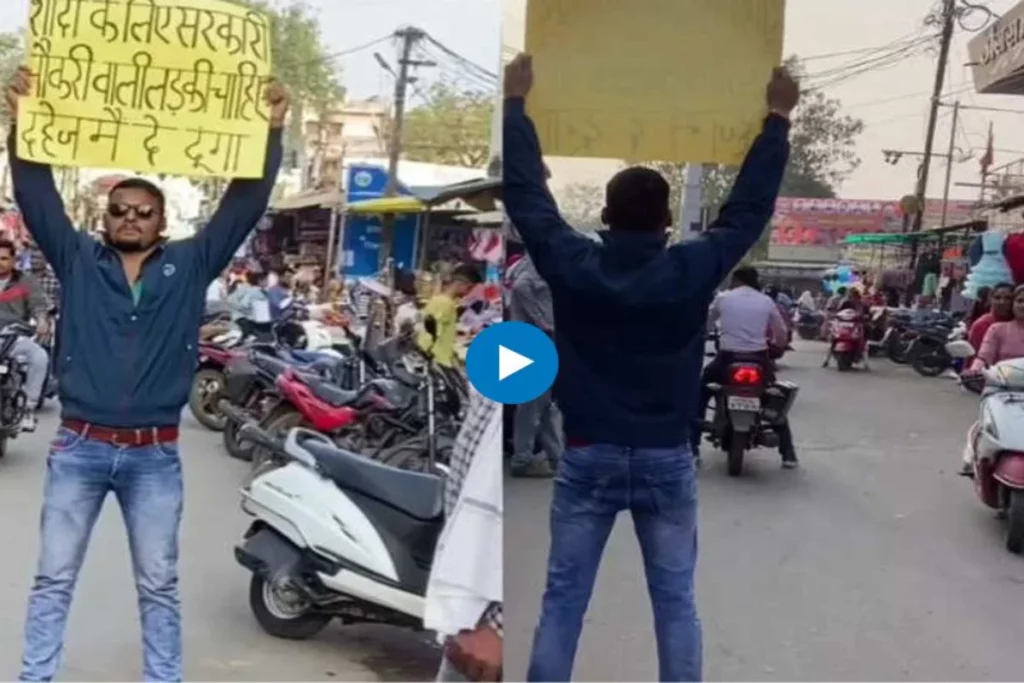 इस वीडियो को इंस्टाग्राम पर विकल्प मालवी के नाम के यूजर ने पोस्ट किया है। इस वीडियो में देखा जा सकता है कि एक शख्स ने काला चश्मा लगाकर बीच सड़क में पोस्टर पकड़ कर खड़ा हुआ है लोग उसे देख रहे हैं और जब पोस्टर पढ़ रहे हैं तो उन्हें हंसी आ रही है। दरअसल पोस्टर में लिखा है कि, शादी के लिए सरकारी नौकरी वाली लड़की चाहिए दहेज में दे दूंगा। बताया जा रहा है कि, शख्स इस पोस्टर के जरिए समाज में एक मैसेज देने की कोशिश कर रहा है।
