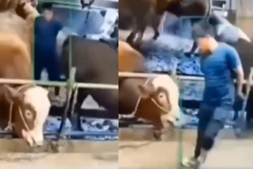 वीडियो किसी फार्म का लग रहा है। इसमें दो गाए अपना चारा खा रही होती हैं। लेकिन तभी पीछे से एक लड़का आता है और उन्हें परेशान करना शुरु कर देता है। इस हरकत के बाद इन दोनों गायों को इतना भयंकर गुस्सा आता है कि, वो दोनों को पटक-पटक कर मारना शुरु कर देती हैं और लड़के ही हालत पस्त कर देती हैं। गायों के हमले से लड़का बुरी तरह से घायल हो जाता है और ये वीडियो वायरल हो जाता है।
