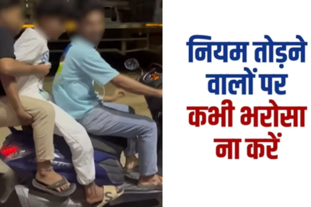 जहां तक इस वीडियो की बात करें तो इसकी शुरुआत होती है सड़क किनारे स्कूटी से चल रहे तीन दोस्तों से जो ट्रैफिक नियमों को ताक पर रखकर हवा में उड़ते हुए जा रहे हैं। इस दौरान वे एक से बढ़कर एक गलतियां कर रहे हैं। जहां पहली गलती तीन लोग एक साथ सवारी कर रहे हैं तो दूसरी गलती की बात करें तो वे तीनों बिना हेलमेट के नजर आए।वहीं सड़क पर स्टंट करने को कानून में गुनाह माना जाता है और ऐसे लोगों को जुर्माना भी देना पड़ता है।