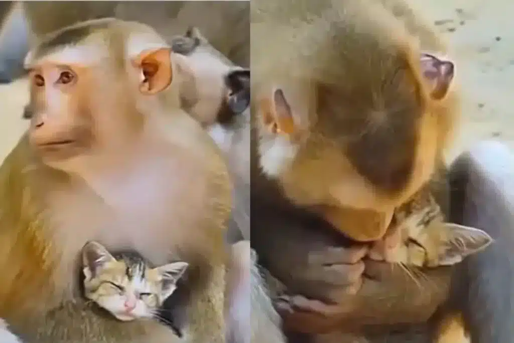 बिल्ली के बच्चे को देख जागी बंदरिया की ममता Viral Video
