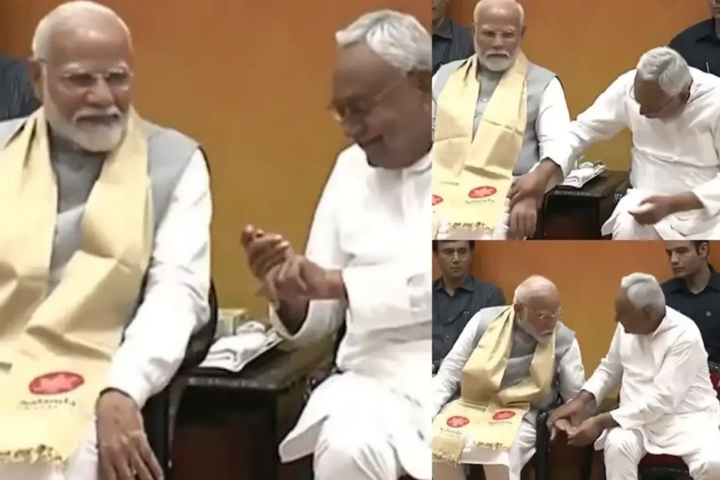 सियासत के माहिर खिलाड़ी माने जाने वाले नीतीश कुमार आज खास अंदाज में नजर आए। उन्होंने नालंदा कैंपस का उद्घाटन करने पहुंचे पीएम मोदी के हाथ पकड़ लिए जिसके बाद सोशल मीडिया पर ये मामला छाया नजर आया।