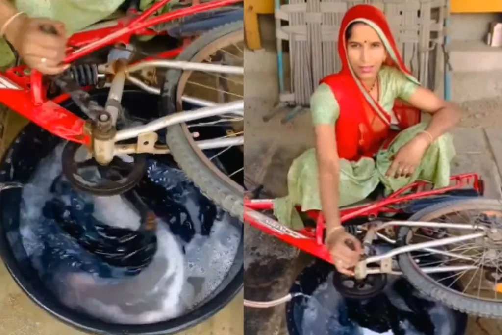 @Babavisavguru_ एक्स चैनल से शेयर किए गए इस वीडियो को 44000 से ज्यादा लाइक्स मिल चुके हैं। वहीं इसके कैप्शन में लिखा गया, “इस देसी वाशिंग मशीन को देखने के बाद वाशिंग मशीन कंपनी का मालिक सदमे में है।” इस वीडियो में आप देख सकते हैं की एक महिला ब्लैक बर्तन पर साइकिल को उल्टा कर रखी हुई है और एक पेडल को चला कर दूसरे पेडल से कपड़े साफ कर रही है। खास बात यह है कि इस बर्तन में पाइप भी लगाया गया है जिससे पानी भी आ रहा है।