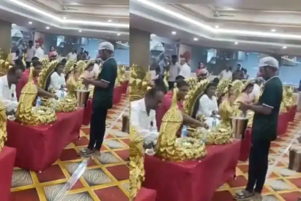 इस शादी में मेहमानों का बेहद राजसी स्टाइल में स्वागत किया गया और खाने से लेकर बैठने तक इंतजाम ऐसा कि लोग तारीफें करते नहीं थक रहे है। ये शादी देखने में साउथ इंडियन लग रही है और सोशल मीडिया पर खूब सुर्खियां बटोर रही है। शादी के वायरल वीडियो में देखा जा सकता है कि मेहमानों के लिए शादी सिंहासन जैसी कुर्सियां रखवाई गई है और खाने के लिए भी राजा महाराजाओं जैसे टेबल स्टैंड रखवाए गए है। खाने की टेबल कुर्सियों को देखकर कहा जा सकता है कि मेहमानों को भगवान मानकर रॉयल सत्कार दिया गया है। साथ ही मोर के डिजाइन को खाने की प्लेट्स भी खूब पसंद की जा रही है।