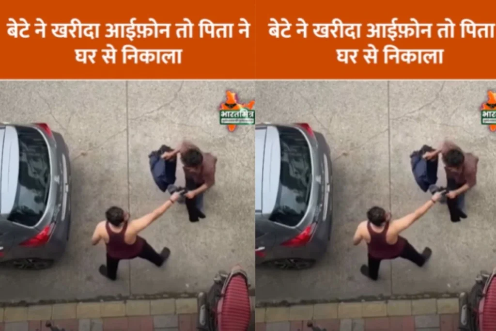 वीडियो में देखा जा सकता है कि, एक पिता अपने जवान बेटे को पीट रहा है. इसके साथ ही वो मार-मारकर अपने घर से बाहर निकाल रहा है. इस वीडियो को ऊपर खड़े पड़ोसी ने रिकॉर्ड किया है. इसके साथ ही वो बता रहा है कि, पिता को बेटे ने 1 लाख का चूना लगाकर आईफोन खरीद लेता है. पिता को जब पता चला तो उसने पीटते हुए बेटे को घर से निकाल दिया.
