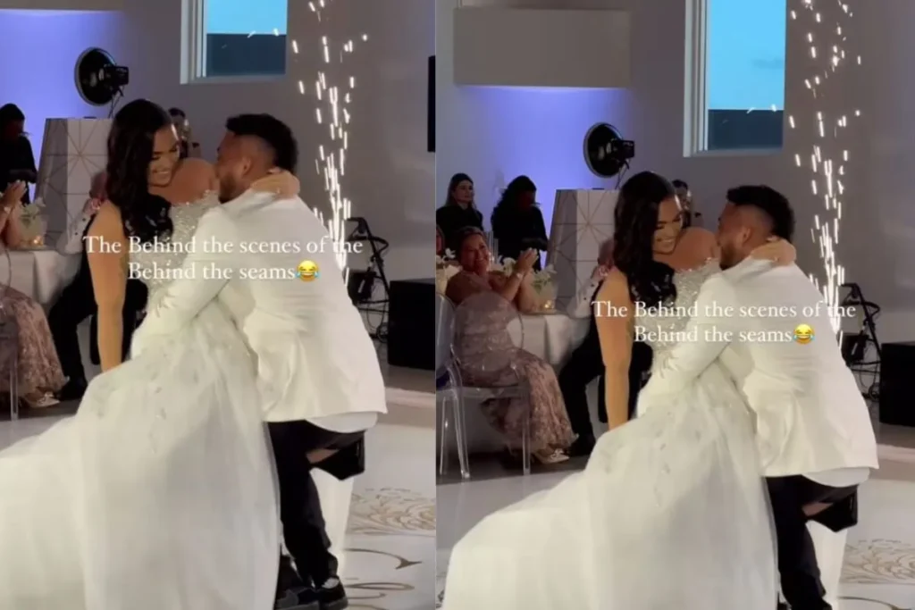 इस घटना के वीडियो को GorAdd नाम के एक्स अकाउंट से शेयर किया गया है। इस वीडियो में देखा जा सकता है कि, सफेद गाउन पहनी दुल्हन के साथ दूल्हा डांस कर रहा है। वो जैसे ही अपनी नई नवेली दुल्हन को गोद में उठाता है। तभी उसकी पैंट पीछे से फट जाती है। दूल्हे को भी अपनी फटी पैंट का एहसास हो जाता है। उसे समझ नहीं आ रहा है कि, वो क्या है। इस दौरान लड़की अपने पति की इज्जत बचाने की कोशिश कर रही है। लेकिन तब तक ये पूरी घटना कैमरे में कैद हो गई और अब इंटरनेट पर काफी तेजी से फैल रही है।