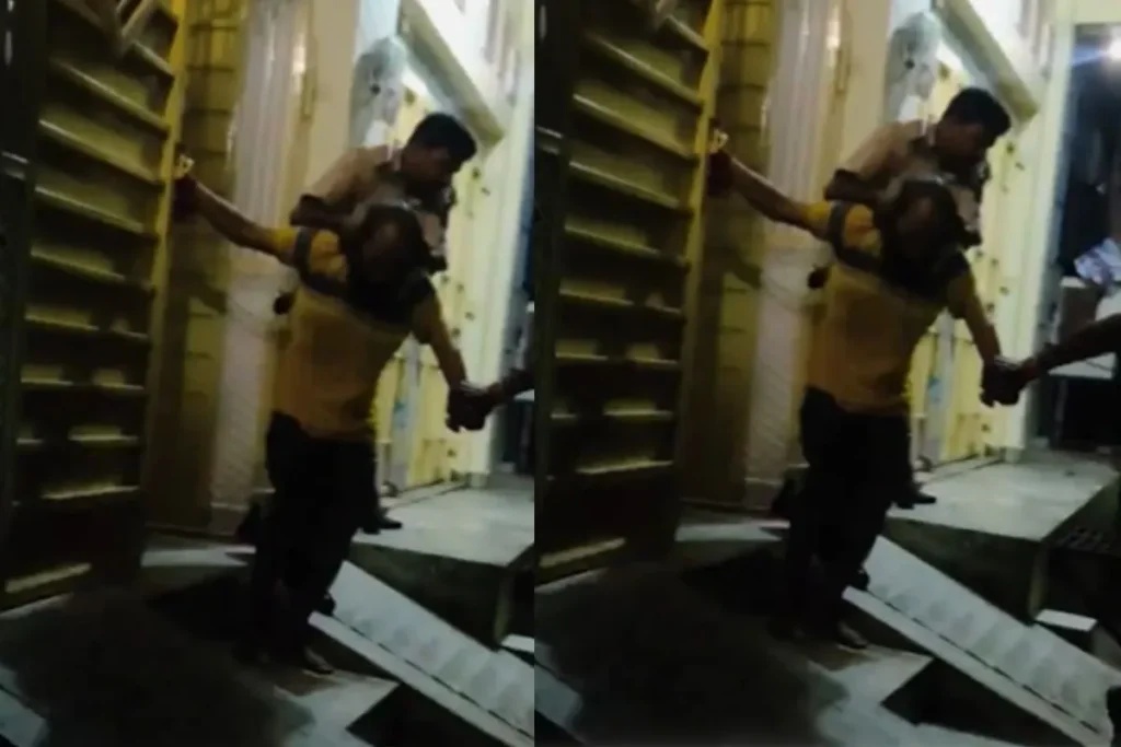इस घटना के वीडियो में देखा जा सकता है कुछ पुलिस वाले एक व्यक्ति को घर से ले जाते हुए दिख रहे हैं. व्यक्ति थोड़ा लड़खड़ा रहा है. इस बीच एक आदमी की आवाज आती है, वह बोलता है की लाइट जलाओ फोकस नहीं आ रहा है. 4 से 5 पुलिस वाले एक आदमी को लेकर जा रहे हैं. बताया जा रहा है कि, जिस आदमी को यह पुलिस वाले लेकर जा रहे हैं वह कोटा के एक हॉस्टल का गार्ड है.