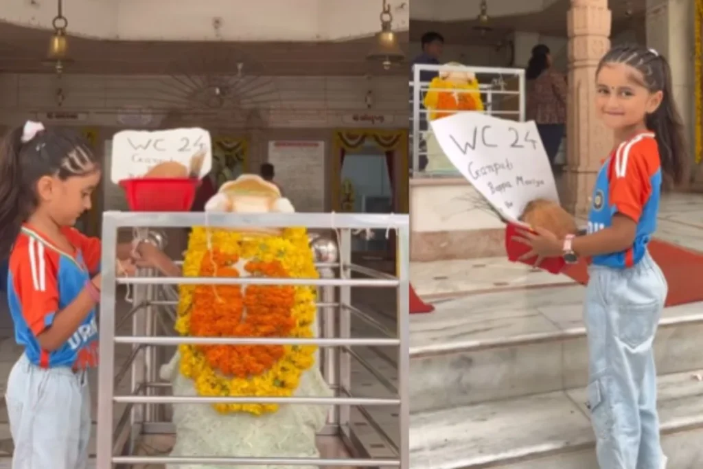 विरल भयानी से जारी इस वीडियो में आप देखेंगे कि एक ब्लैंक पेपर पर यह बच्ची WC 24 गणपति बप्पा ब्रिंग द कप होम लिखकर मंदिर में इसे चढ़ाने जाती है। उसके हाथ में नारियल धूपबत्ती और प्रसाद भी होता है। वह बच्ची काफी क्यूट नजर आ रही है और यही वजह है कि सोशल मीडिया पर यह वीडियो तेजी से वायरल हो रहा है। भारत की जीत के लिए मासूम बच्चे की यह अनोखी आस्था देखने के बाद लोग घायल हो गए हैं।