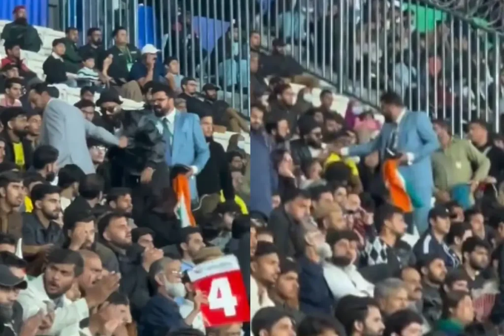 दरअसल, घर के कलेश नामक एक्स हैंडल से एक वीडियो जारी किया गया है जिसमें पाकिस्तानी प्रशासन का तल्ख अंदाज नजर आ रहा है। जानकारी के मुताबिक एक एक भारतीय फैन तिरंगा लेकर लाहौर स्टेडियम में पहुंचा। लाहौर में लहराता तिरंगा पाकिस्तानियों को रास नहीं आया और उन्होंने शख्स की शिकायत कर दी। इसके बाद आनन-फानन में प्रशासनिक अधिकारी आए और युवक को खींचकर बाहर ले गए। Viral Video में देखा जा सकता है कि कैसे सूटधारी अधिकारी भारतीय तिरंगा हाथ में लिए एक शख्स को बाहर ले जा रहे हैं।