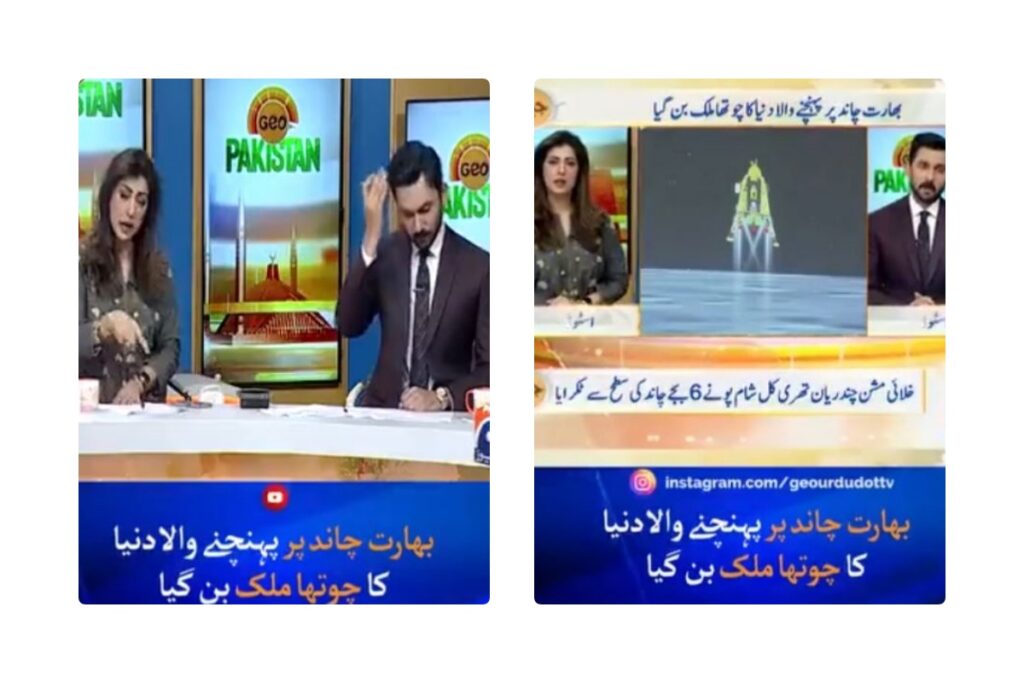 सोशल मीडिया पर पाकिस्तानी न्यूज चैनल Geo TV का वीडियो वायरल हो रहा है जिसमें एक महिला और एक पुरुष पत्रकार आपस में बात-चीत करते नजर आ रहे हैं। इसमें पत्रकार कह हे हैं कि हम देखते रह गए और भारत चांद पर पहुंच गया। इसके अतिरिक्त दोनों पत्रकारों को यह कहते हुए सुना जा सकता है कि हम बीच में फंसे हुए हैं, अपनी लड़ाइयों में पड़े हुए मुश्किल हालात में है। हमें अपनी सोचने की क्षमता को बढ़ाने की जरुरत है। इस पर पुरुष एंकर कहते हैं कि हम अपने बच्चों को ही चांद कहे जा रहे हैं हालाकि इसके जवाब में महिला एंकर कहती है कि हमारे बच्चे तो अच्छे हैं। उसके बाद पुरुष एंकर कहता है कि हम एक जैसे हैं, हमारा रंग एक जैसा है फिर भी हम में बहुत फर्क है। उन्होंने अपने बात-चीत के संदर्भ में कहा कि अमूमन इसकी उम्मीद पश्चिमी देशों रुस या चीन की जाती है, पर नहीं इस बार भारत ने इसे कर दिखाया है।