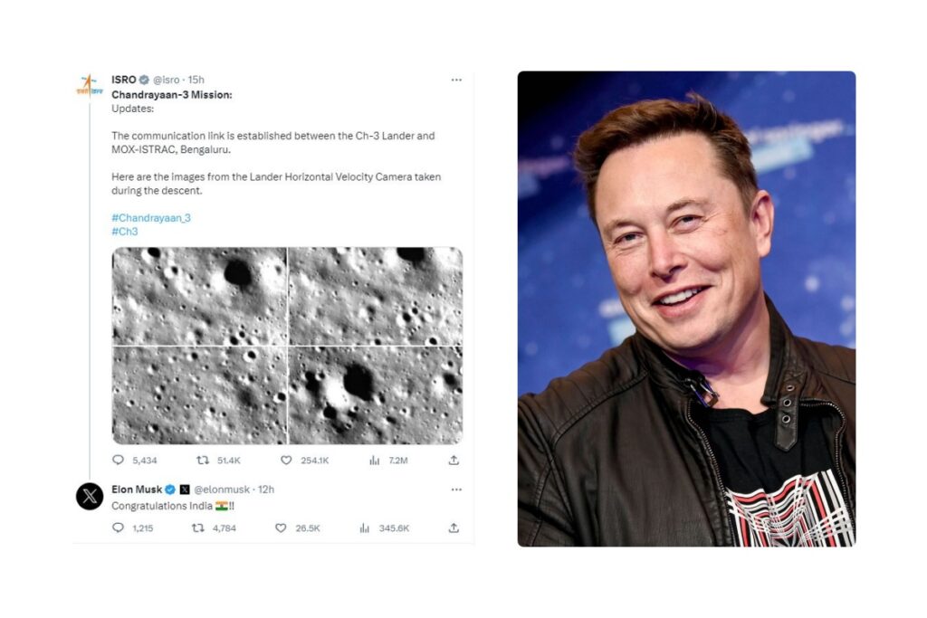 Elon Musk on Chandrayaan 3: इंडियन स्पेस रिसर्च ऑर्गनाइजेशन (ISRO) द्वारा संचालित की जा रही चंद्रयान-3 (मिशन मून) मिशन की चर्चा पूरे विश्व में जोरों पर है। इसको लेकर बता दें कि भारत ने 23 अगस्त की शाम 6 बज कर 4 मिनट पर चंद्रमा पर अपने अंतरिक्ष यान चंद्रयान-3 को उतार कर इतिहास रच दिया है। यही वजह है कि देश और दुनिया के तमाम दिग्गज भारत की इस उपलब्धि पर समस्त देशवासियों को बधाई भेज रहे हैं और इस ऐतिहासिक कदम की जम कर सराहना कर रहे हैं। इसी कड़ी में X (ट्विटर) के सीईओ एलन मस्क ने भी चंद्रयान-3 की सफलता को लेकर भारत के लिए अपना संदेश भेजा है। मस्क ने ईसरो के आधिकारिक X (ट्विटर) हैंडल के पोस्ट पर रिप्लाई में “कांग्रेचुलेशन इंडिया” लिखा है।