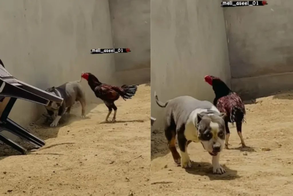 इस Animal Video को meli_aseel_01 नाम के इंस्टाग्राम अकाउट पर अपलोड किया गया है। इस वीडियो में देखा जा सकता है कि, एक घर में पिटबुल कुत्ता और मुर्गा दिख रहा है। अचानक से इस बड़े और खूंखार दिखने वाले कुत्ते को मुर्गा रोक लेता है और आंखें दिखाने लग जाता है। इतना ही नहीं मुर्गा इस कुत्ते पर हमला करने की भी कोशिश करता है। मुर्गे की इस हिम्मत को देख कुत्ता सहम जाता है और वहां से निकलने में ही अपनी भलाई समझता है।