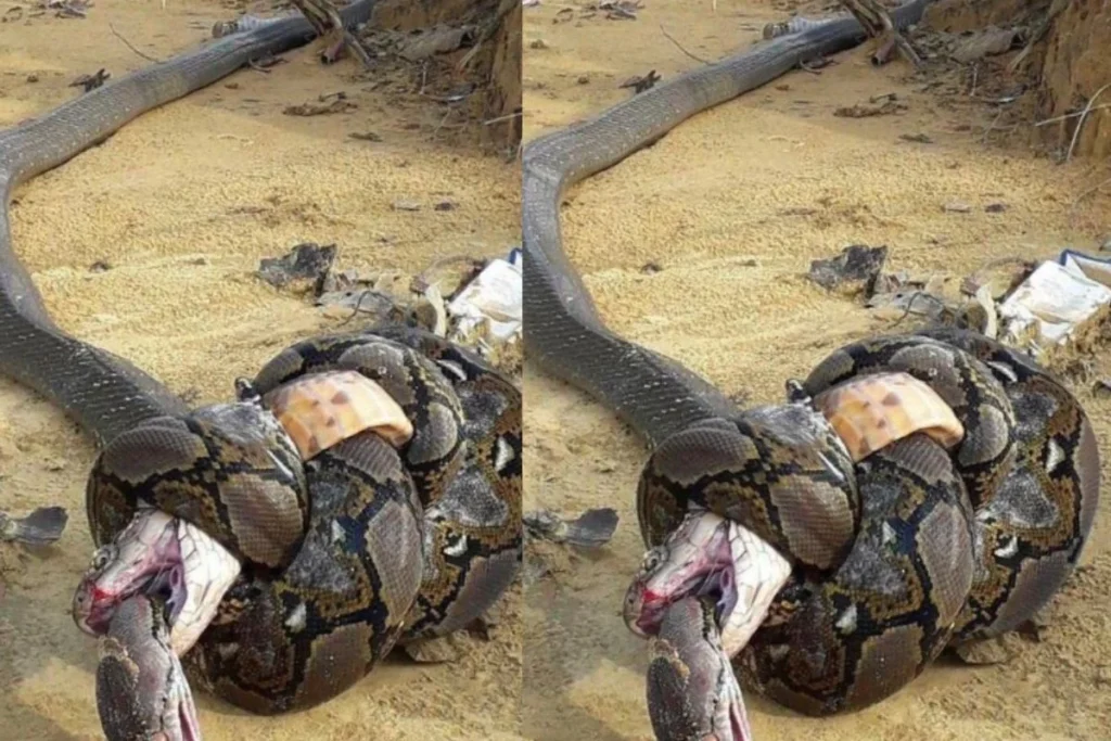 @AMAZINGNATURE एक्स चैनल से शेयर किए गए इस तस्वीर के कैप्शन में कहा गया, “किंग कोबरा ने अजगर को काटा अजगर ने कोबरा को जकड़ लिया। कोबरा कुचलकर मारा गया, कोबरा के जहर से अजगर की मौत। इस कैप्शन से साफ जाहिर है कि पहले किंग कोबरा ने अजगर को काटा तो गुस्से में अजगर ने भी कोबरा को जकड़ लिया। विशाल अजगर के सामने कोबरे का एक नहीं चला और वह कुचल कर मारा गया। विशाल अजगर ने किंग कोबरा को तो मार डाला लेकिन वह खुद भी अपनी जान नहीं बचा सका। दोनों की मौत हो गई।