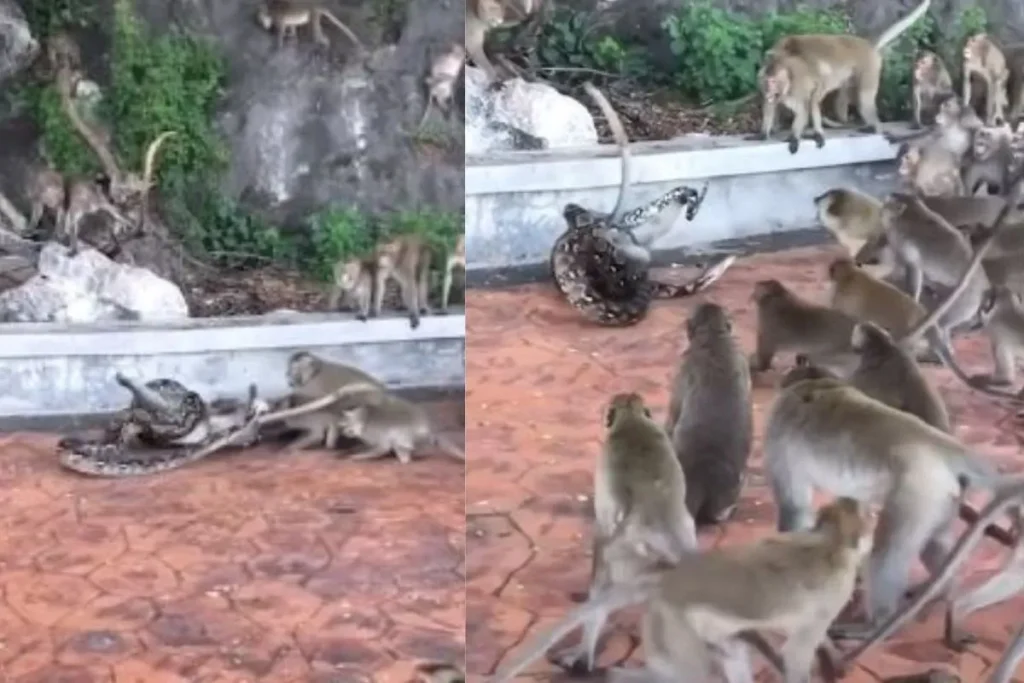 बंदरों के झुंड पर भारी पड़ा इकलौता अजगर