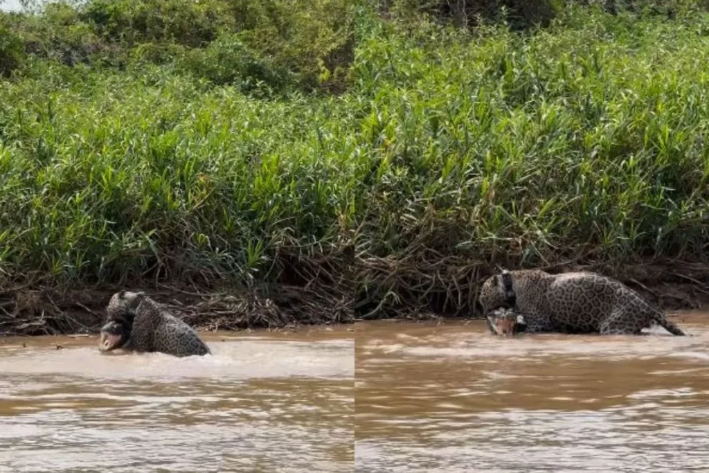जगुआर ने पानी में घुसकर मगरमच्छ का किया शिकार