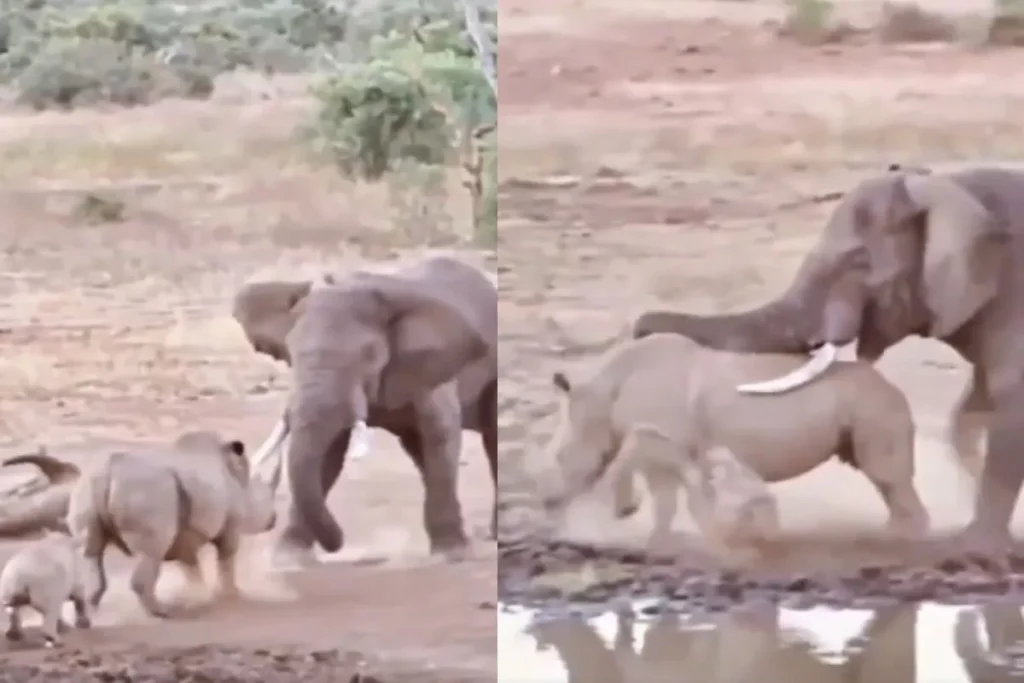 बच्चे को बचाने लिए हाथी से भिड़ा गैंडा