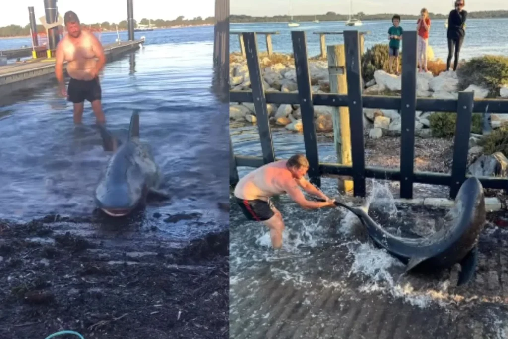 शार्क की पूंछ पकड़कर मजाक करता शख्स