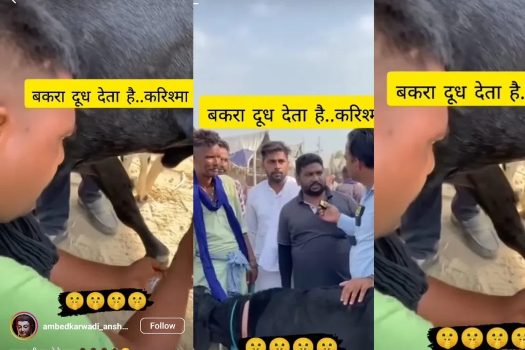 इस वीडियो में एक काले रंग का बकरा दिख रहा है, जो कि नर और मादा दोनों के अंगों के साथ है। हैरानी की बात ये है कि, ये बकरा दूध भी दे रहा है। वीडियो में काफी सारे आदमी इस काले रंग के बकरे के साथ दिख रहे हैं और इसकी रियलिटी भी चेक कर रहे हैं। इस वीडियो को shayarbhai52 नाम क इंस्टाग्राम अकाउंट से शेयर किया गया है। बकरे को दूध देता हुआ देख लोग काफी हैरत में पड़ गए हैं।