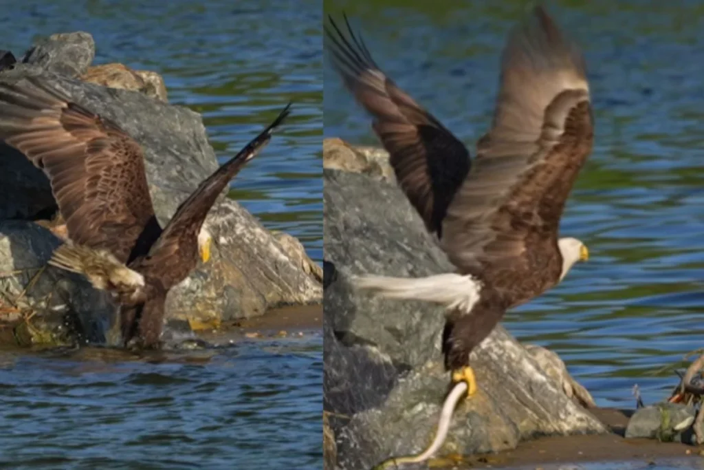 वायरल हो रहे इस वीडियो की बात करें तो इसमें आप देख सकते हैं कि पेड़ पर से चील पहले उड़ते हुए नजर आ रहा है लेकिन अचानक ही वह नीचे आने लगता है। वह फिर पानी में डुबकी लगाता है। एक पल के लिए ऐसा लगता है जैसे वह पानी में किसी का इंतजार करेगा और अपने शिकार को ढूंढेगा। लेकिन पलक झपकते वह पानी से ऊपर उठने लगता है और उसके साथ होता है एक सांप। इसे देखकर आप हैरान रह जाएंगे। वीडियो में आप देखेंगे कि कैसे चील ऊंचाई से ही पानी में सांप को देख लेता है और फिर अपना शिकार उसे बना लेता है।
