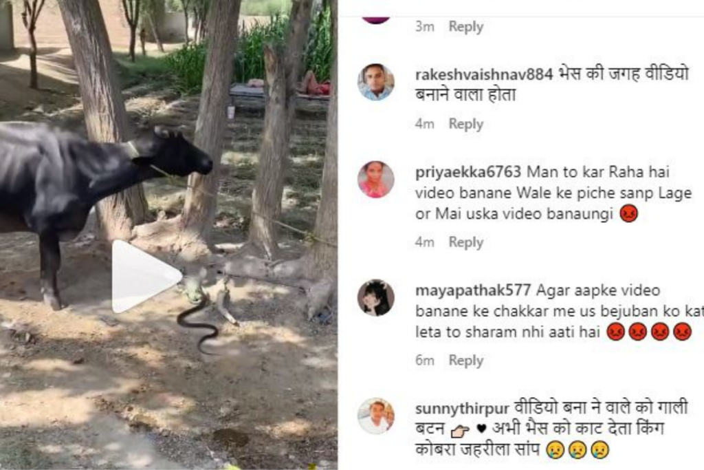 इन दिनों सोशल मीडिया (इंस्टाग्राम) पर एक बेजुबान भैंस और साक्षात् काल (सांप) का वीडियो बहुत तेजी से वायरल हो रहा है। वीडियो में साफ देखा जा सकता है, कि एक भैंस की गले की रस्सी को पेड़ से बांधा गया है। तभी एक काले कलर का नाग सम्भवतः (ब्लैक इंडियन स्पेक्टिकल कोबरा) वहां से जाता है। ऐसे में अचानक से सांप आ जाने से भैंस घबरा जाती है। और वह भागने की कोशिश करती है। लेकिन उसकी मदद करने के लिए कोई नहीं आता। इस दौरान वीडियो बनाने वाला मज़े से वीडियो बनाता ही रहता है। ऐसे में यूजर्स इस बात को लेकर काफी भड़के हुए हैं।