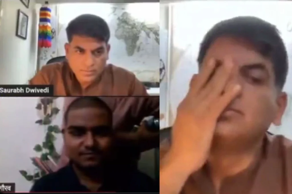 वीडियो में ‘द लल्लनटॉप’ के सौरभ सहित 4 बड़े पत्रकार बैठे हैं। किसी मुद्दे पर ऑन लाइन डिस्कशन कर रहे हैं। तभी गौरव नाम के व्यक्ति के पीछे एक युवक आता है। उसके हाथ में किसी ड्रिंक की कैंन दिख रही हैं। अचानक से कैमरे का फ्रेम बदलता है और सौरभ द्विवेदी का सिर पकड़ते हुए रिएक्शन वायरल हो जाता है। कुछ ही सेकंड के इस वीडियो की सत्यता की हम पुष्टि नहीं करते हैं. लेकिन यूजर्स इसे देखकर काफी मजेदार प्रतिक्रियाएं दे रहे हैं।