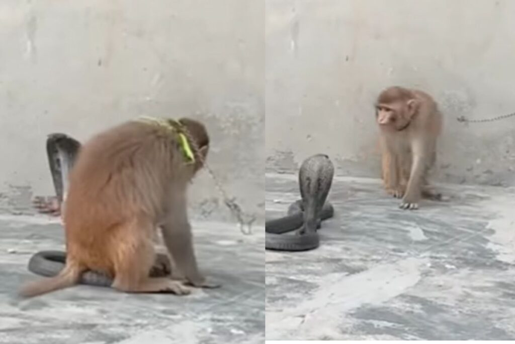 हाल ही में सोशल मीडिया पर एक वीडियो खूब तेजी से वायरल होते हुए नजर आ रहा है। इस वीडियो में दो कोबरा सांप और बंदर की मस्ती देखने को मिली है। इस वीडियो में एक बात देखने में थोड़ी अजीब सी लगी कि बंदर को बांध कर रखा हुआ है। लेकिन इसके बावजूद बंदर जिस तरह से कोबरा सांप की पूंछ पकड़कर उसे पटकते हुए दिखाई दे रहा हैं। बंदर सांप की पूंछ पकड़कर उसे इधर-उधर फेंक रहा था, तभी गुस्से में बौखलाता हुआ कोबरा सांप उसे डंक मारने की कोशिश करता है, उतने में साइड से एक और कोबरा सांप बंदर की तरफ आते हुए दिखाई दे रहा है। यह वीडियो यूजर्स के द्वारा काफी देखी गई है।