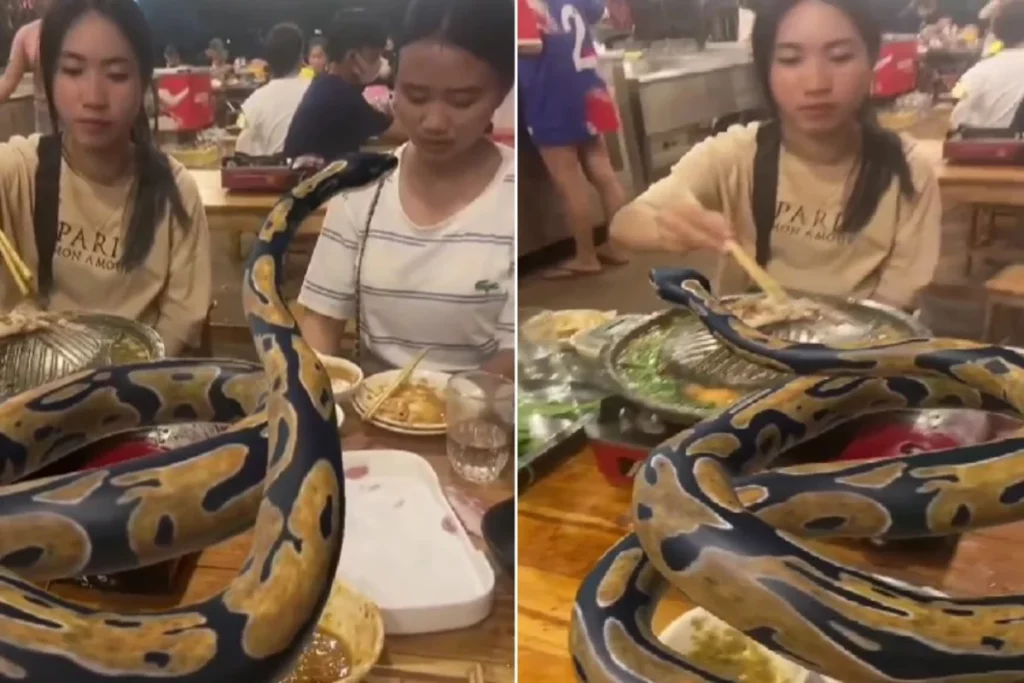 दो लड़कियों के साथ डिनर कर रहा विशालकाय सांप
