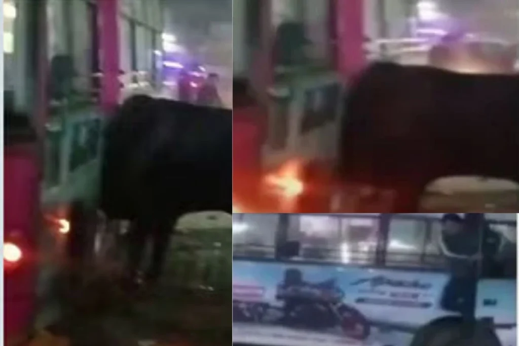 आस-पास काफी भीड़ देखा जा सकती है। तभी अचानक से एक काला सांड गाड़ी के अंदर आ जाता है और तोड़-फोड़ मचाना शुरु कर देता है। वीडियो में देखा जा सकता है कि, वह बस के शीशों को तोड़ रहा है। आस-पास काफी भीड़ देखी जा सकती है। इस दौरान गाड़ी में बैठे लोग काफी डरे हुए हैं और खुद की जान बचाने के लिए यहां-वहां भाग रहे हैं। ये घटना 10 फरवरी का रात की बताई जा रही है।