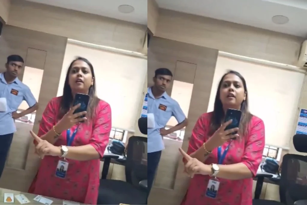 इसके साथ ही कैप्शन में लिखा है कि, कर्नाटक के लोगों पर हिंदी थोपते हैं, ग्राहकों के साथ दुर्व्यवहार करते हैं, ड्यूटी। ये SBI बैंक की शाखा से जुड़ा हुआ है। वीडियो में देखा जा सकता है कि, महिला लगातार ग्राहक पर हिन्दी बोलने पर विवश कर रही है। क्योंकि उसे हिन्दी नहीं आती है इसलिए वो बार-बार मना कर रहा है। वीडियो में साफ देखा जा सकता है कि, महिला बैंक मैनेजर ग्राहक के साथ बहुत ही गलत ही व्यवहार कर रही है।