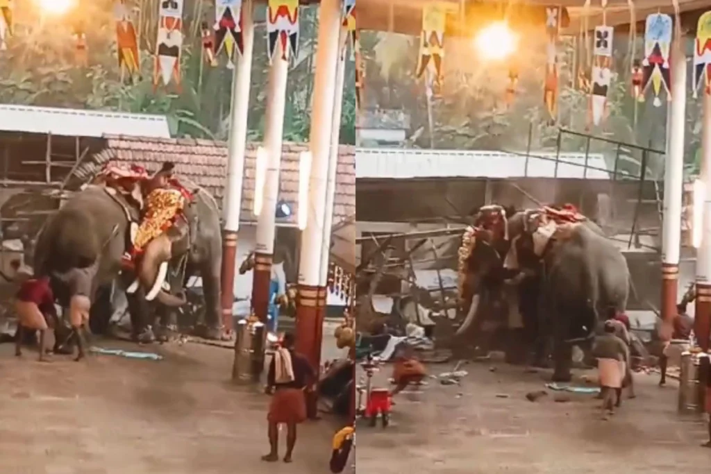 मंदिर में अचानक दो हाथियों ने खोया आपा