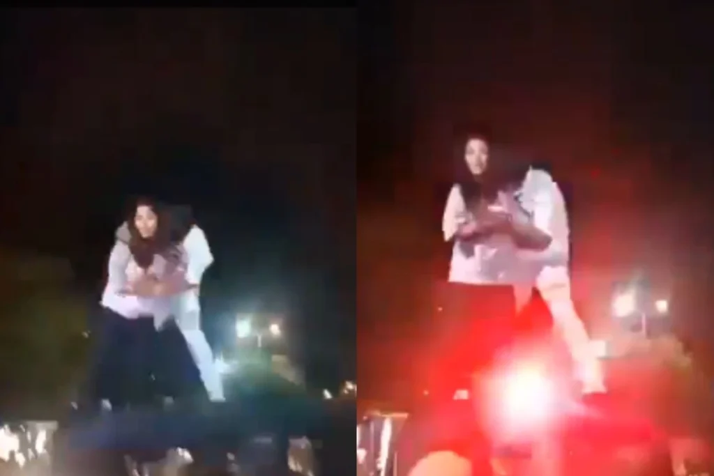 इस वीडियो में देखा जा सकता है कि, एक लड़का और लड़की कार पर चढ़े हुए हैं और चीख-चिल्ला रहे हैं। इस दौरान वहां पर मौजूद पुलिस और भीड़ उन्हें रोकने की कोशिश कर रही है। लेकिन दोनों नशे में इस कदर चूर हैं कि, वो ना तो किसी की सुन रहे हैं और ना ही कार से उतर रहे हैं। लेकिन तभी अचानक से दोनों नीचे गिर जाते हैं। इसके बाद पुलिस उन्हें ले जाती हुई दिख रही है।