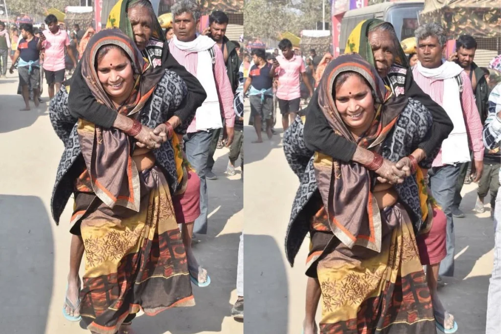 Maha Kumbh 2025 की सबसे खूबसूरत वायरल तस्वीर, सास को कंधे पर टांगकर बहू स्नान कराने पहुंची
