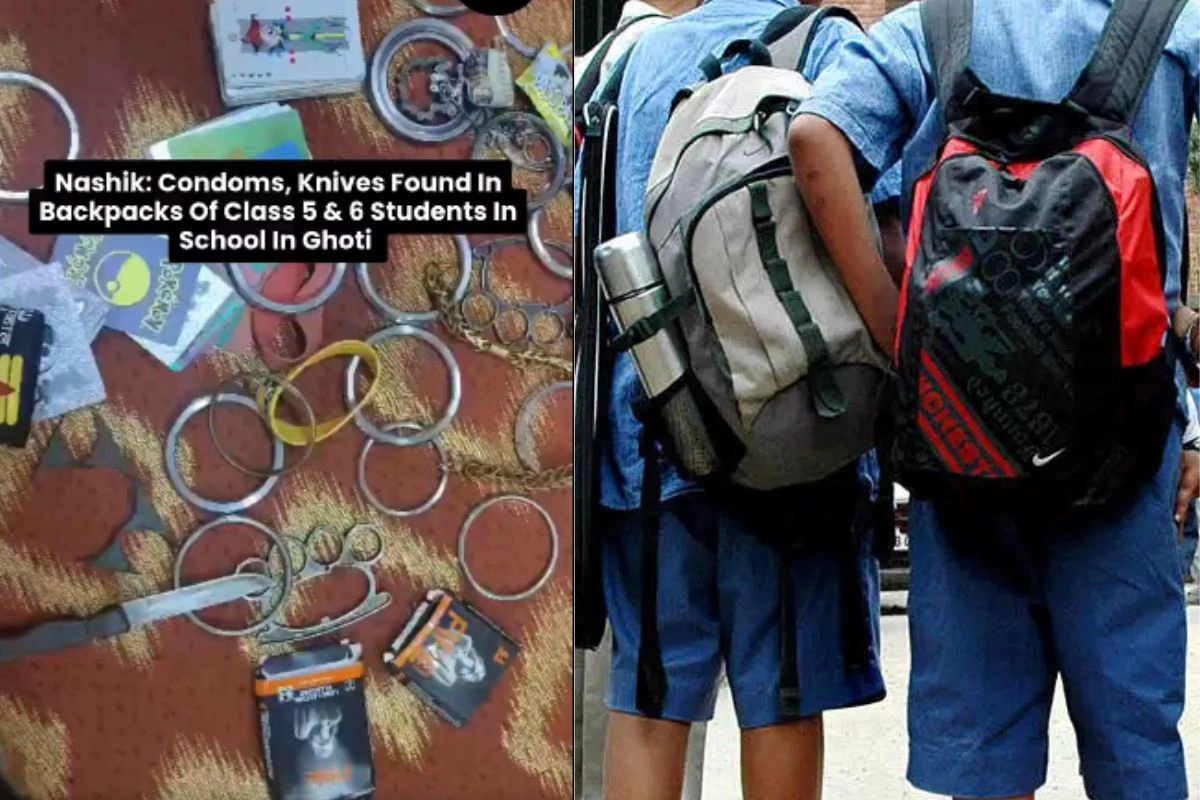 Nashik School Viral Video: महाराष्ट्र के नासिक से एक हैरान करने वाला मामला सामने आया है। यहां के एक स्कूल में छात्रों के बैग से कंडोम, चाकू और नशीले पदार्थ के साथ-साथ तमाम आपत्तिजनक चीजें निकली हैं। इन्हें देखने के बाद पहले तो शिक्षकों को झटका लगा, इसके बाद उन बच्चों के माता-पिता को लगा जिनके बैग से ये आपत्तिजनकर सामान मिला है। छात्रों के बैग से निकली इन तमाम विवादित चीजों का ये वीडियो Social Media पर छाया हुआ है। पढ़ने की उम्र में स्कूली बच्चों के बैग से निकली इन चीजों को देखकर लोगों को अफसोस हो रहा है।