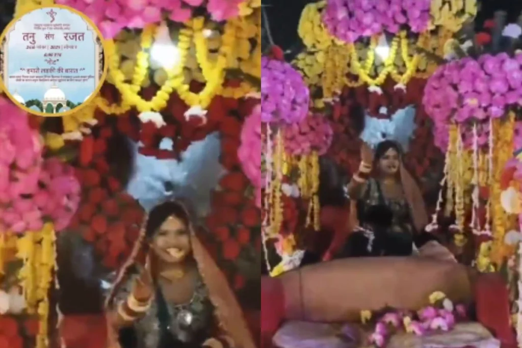 इस वीडियो में साफ देखा जा सकता है कि, दुल्हन रथ पर सवार होकर अपने रिश्तेदारों के साथ बारात लेकर दूल्हे के घर जा रही है। इस दौरान वो खड़े होकर झूमकर नाच रही है। आस-पास के लोग काफी खुश हैं।