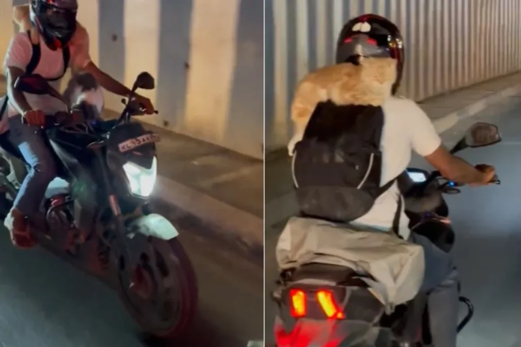 सोशल मीडिया पर ‘अरुण गोवधा’ के ट्विटर एकाउंट पर एक वीडियो शेयर किया गया है। जिसके कैप्शन में लिखा है ‘आज ORR में यह लड़का मिला।’ इस वीडियो में देखा जा सकता है कि एक शख्स रोड पर बाइक चला रहा है और उसने अपने पीछे कंधे पर बैग टांगा हुआ हैं, जिस पर एक बिल्ली बैठी हुई है। चलती बाइक पर भी बिल्ली को बैग के ऊपर बैठने में कोई डर नहीं लग रहा। इसके बाद वीडियो में देखा जाता है कि आगे की तरफ पेट्रोल की टंकी पर भी एक बिल्ली बैठी हुई है, जिसे देखने के बाद सोशल मीडिया यूजर्स को थोड़ा झटका लग गया। अब इसे देखकर ऐसा लगता है कि बिल्ली को बाइक पर सफर करने का शौक है। यह वायरल वीडियो बेंगलुरु की बताई जा रही है। लेकिन अभी इस मामले में कोई खास जानकारी नहीं है।