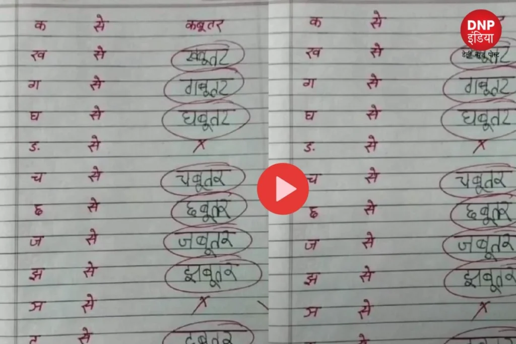 इसमें बच्चे ने शायद अपने होमवर्क करने की कोशिश की है। टीचर ने बच्चे को क, ख, ग, लिखने के लिए कहा है। ऐसे में बच्चे ने जो लिखा है उसे देखने के बाद आपकी भी हंसी छूट जाएगी। बच्चे के क से कबूतर तो लिखा है लेकिन ख से खबूतर, ग से गबूतर, घ से घबुतर, और इसी तरह से आगे की वर्णमाला को लिख रखा है। ऐसे में टीचर ने भी इस बच्चे के लिए हुए को गोल बना दिया है।