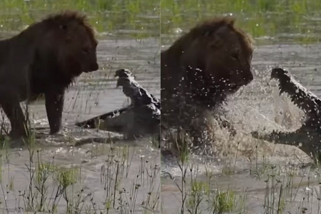 वायरल वीडियो में देखें मगरमच्छ ने डाली शेर के खाने पर नज़र