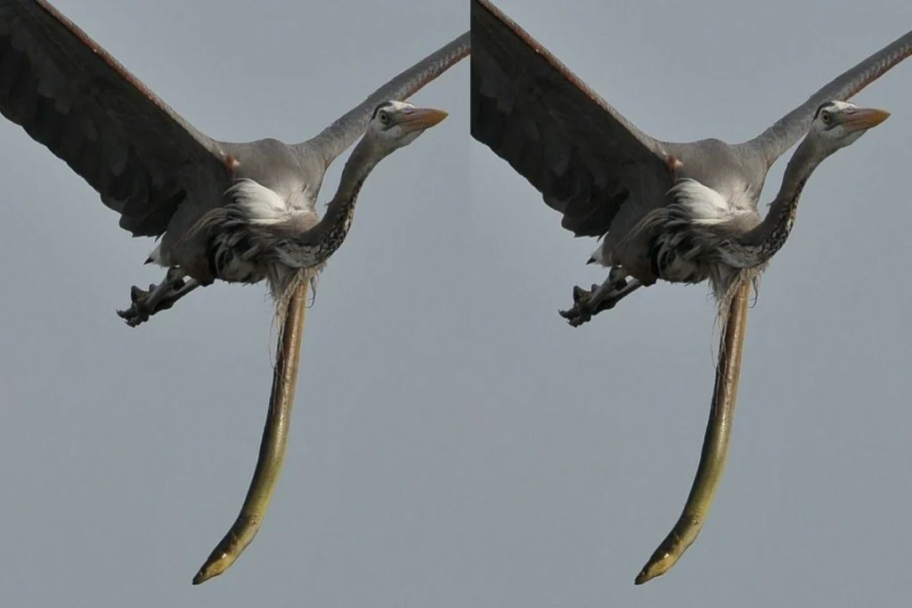 उड़ते हुए बगुले के पेट को चीरकर ईल मछली आयी बाहर