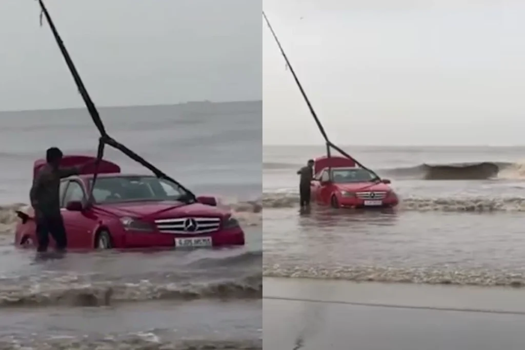 समुन्द्र में महंगी मर्सिडीज कार से स्टंट करना 18 साल के युवक को पड़ा भारी