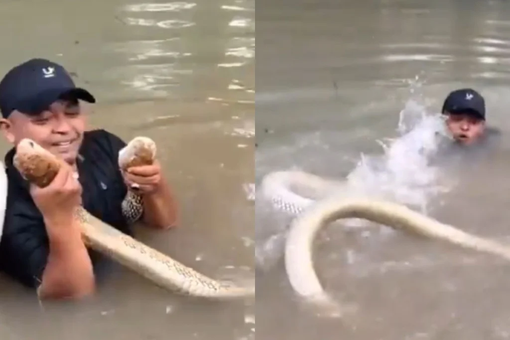 इस वीडियो में देखा जा सकता है कि, एक आदमी पानी में खड़े होकर दो सांपों के साथ खेल रहा होता है। उसे जरा भी अंदाजा नहीं है कि, उसका ये मजा चंद पलों में सजा बनने वाला है। जिन दोनों सांपों की उसने गर्दन पकड़ी हुई थी वो ही उस पर हमला कर देते हैं। इसके बाद दोनों उसकी तरह दौड़ने लगते हैं। आदमी को एहसास हो जाता है कि, वो अब बचने वाला नहीं है यही वजह है कि, वो किनारे की तरफ भागने लगता है। बहुत ही मुश्किल से उसकी जान बचती है।