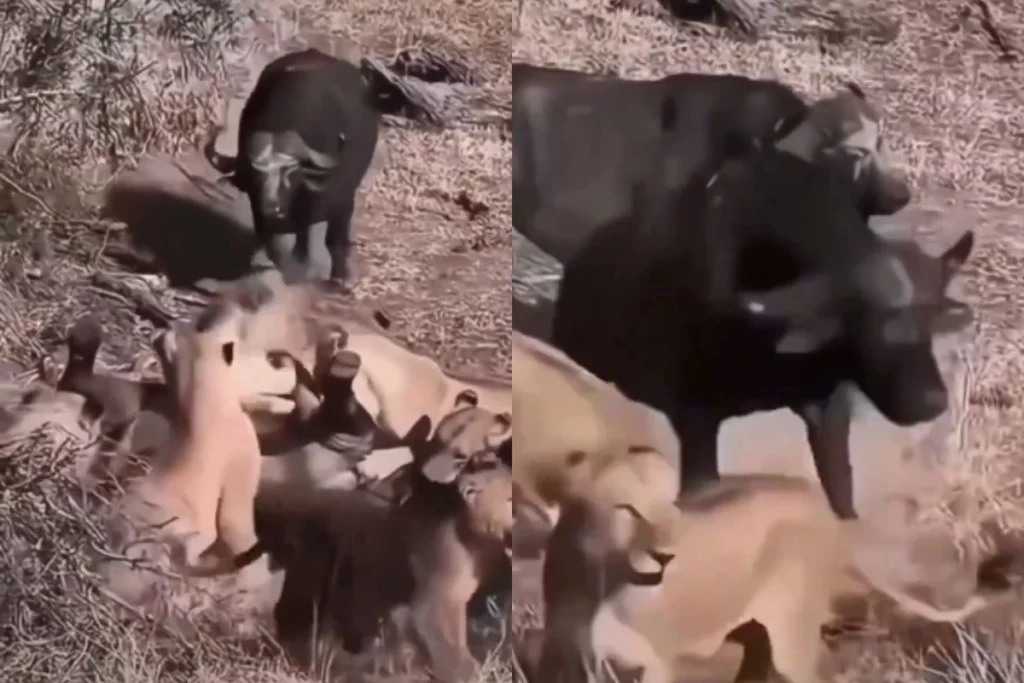 वीडियो में देखा जा सकता है कि, शेरों के झुंड ने एक भैंसे को जमीन पर गिराया हुआ है और उस पर टूट पड़ते हैं। इस दौरान वह बेबस होकर जमीन पर गिरा हुआ है। शेरों के झुंड से घिरा भैंसा अपनी अंतिम सांस गिन ही रहा होता है, तभी उसका साथी सामने से आता है और शेरों से भिड़ जाता है। वीडियो के अंत में वह अपने साथी को बचाने में कामयाब हो जाता है। ये दोनों मिलकर जंगल के खूंखार शिकारियों को भगा देता है।