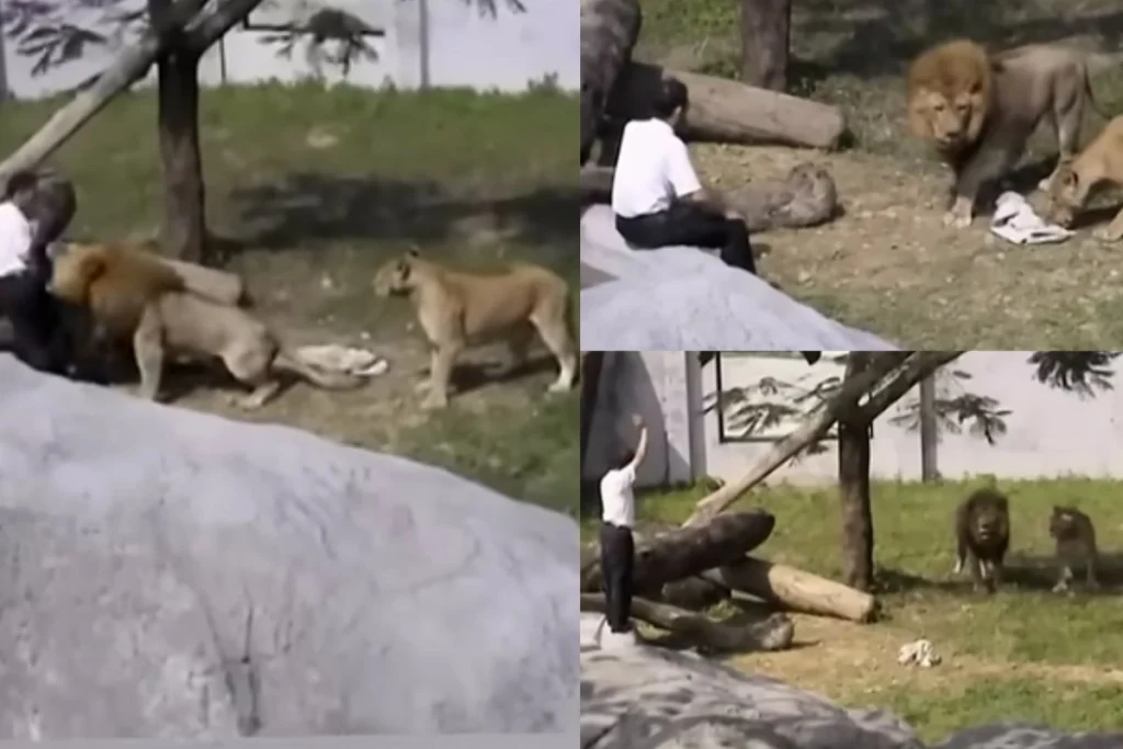 इस वायरल वीडियो ने यूजर्स को चौंकाया हुआ है। इसमें देखा जा सकता है कि, एक शेर और शेरनी के बाड़े में अचानक से आदमी की एंट्री होती है। वो उनके ऐसे करीब जा रहा है जैसे कि, ये उसके पालतू जानवर हो। लेकिन तभी अचानक से शेर को गुस्सा आता है और वो हमला कर देता है।