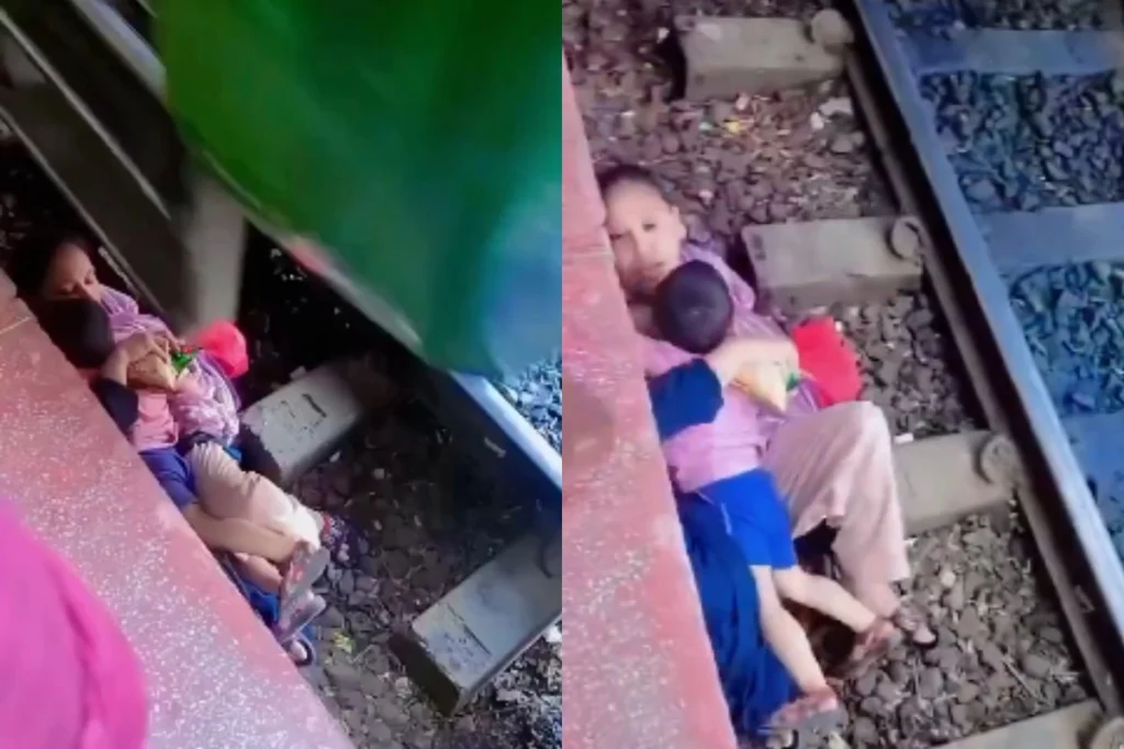 वीडियो में देखा जा सकता है कि, ट्रेन की पटरी के नीचे एक मां और बेटा गिरे हुए हैं। इस दौरान बच्चा अपनी मां की छाती से चिपका हुआ है। दोनों के ऊपर से मौत गुजर रही है। लेकिन ये बहुत ही हिम्मत और धैर्य से स्थिति को संभालते हैं। वीडियो के अंत में ट्रेन इनके ऊपर से गुजर जाती है। वह दोनों बचे रहते हैं। इस वीडियो को देख लोगों की रुह कांप रही है। ये वीडियो कब और कहां का है? इसकी कोई भी आधिकारिक जानकारी मौजूद नहीं है। लेकिन ये घटना लोगों को सोच में डाल रही है।