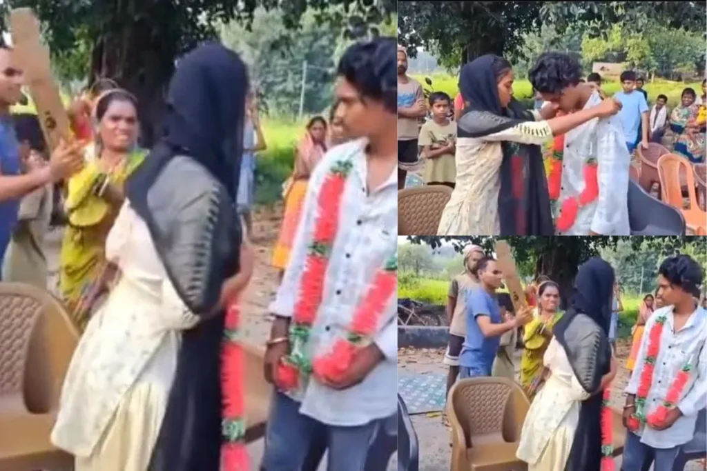 इस Viral Video को एक्स पर Ghar Ke Kalesh नाम के एक्स अकाउंट पर अपलोड किया गया है। इसके साथ ही कैप्शन में लिखा है कि, “लव मैरिज के दौरान मां को आया गुस्सा।” इस वीडियो में देखा जा सकता है कि, एक लड़का और लड़की कुछ लोगों के सामने एक-दूसरे को वरमाला डालकर शादी कर रहे हैं। इन्हें देखने से ऐसा लग रहा है जैसे इनकी शादी लवमैरिज हो रही हो और परिजन खुश ना हो। आस-पास खड़े लोगों के चेहरे पर मायूसी साफ देखी जा सकती है। लड़का और लड़की जैसे ही एक-दूसरे के गले में वरमाला डालते हैं वैसे ही लड़की की मां को गुस्सा आ जाता है और वह बल्ला उठाकर अपनी बेटी के जोर से मार देती है। इसके बाद पीछे खड़ा लड़का महिला को रोकता है। मां से पिटने के बाद लड़की भी हैरान हो जाती है।