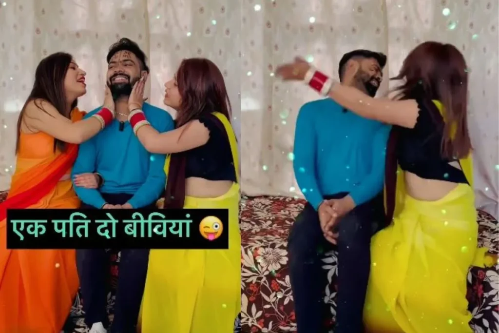 इस Viral Video को इंस्टाग्राम पर अपलोड किया गया है। वीडियो में देखा जा सकता है कि, दो पत्नियां अपने इकलौते पति को बीच में बैठकर प्यार लुटा रही हैं। इन दोनों ने आदमी के दोनों गालों को अपनी-अपनी साइट बताया हुआ है और इन गालों पर प्यार लुटा रही हैं। इतना प्यार मिलता हुआ देख आदमी काफी खुश हो रहा है। तभी एक पत्नी उठाकर कुछ लेने के लिए घर के अंदर जाती है और दूसरी पत्नी आदमी के दूसरे गाल पर थप्पड़ बरसाना शुरु कर देती है और बोलती है हम दोनों मिलकर इसके साइड वाले गाल को मारेंगे। बीवी के इस दिमाग और मार को देख आदमी हैरत में पड़ा जाता है।