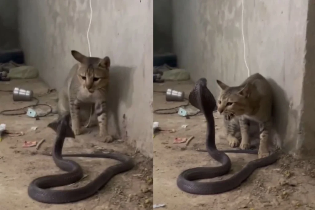 बिल्ली ने निकाली काले नाग की सारी हेकड़ी