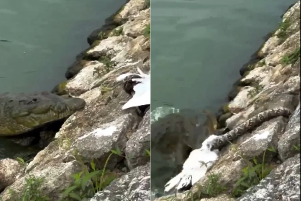अचानक से एक मगरमच्छ सांप पर झपटता है और अजगर को उसी के निवाले के साथ पानी में घसीटता हुआ ले जाता है। इस दौरान मोटा अजगर खुद को बचाने की कोशिश तो कर रहा है। लेकिन मगरमच्छ के मजबूत जबड़े और नुकीले दांतों के आगे बेबस हो चुका है।