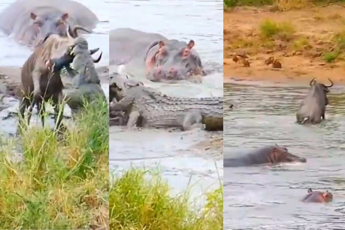 हिप्पो ने मगरमच्छों से हैरतअंगेज तरीके से वाइल्ड बीस्ट को बचाया